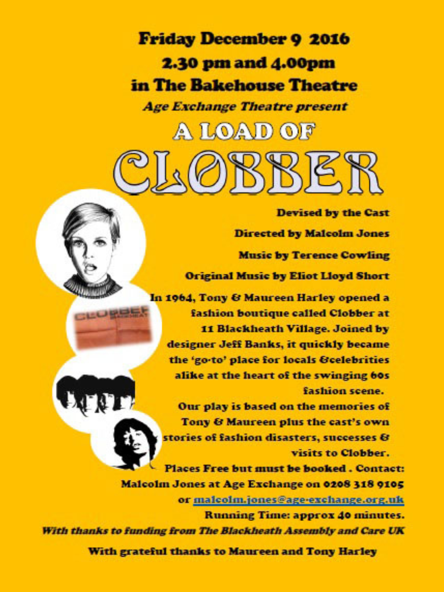 Unexpectedly a couple called Tony and Maureen Harley called into the centre. They had started a famous boutique called Clobber on the site of No11 Blackheath Village where Age Exchange is now situated. Tony and Maureen were happy to be interviewed for the project and their story became the basis of the play. They had started Clobber as a fashion boutique in 1964 and Jeff Banks joined them to work as a designer. New designers such as Zandra Rhodes, Mary Quant and Oz Clarke were changing the face of fashion in England and Carnaby Street was the most popular street in London for young people. Clobber was an immediate hit as youth fashion and the miniskirt were big news. The opening in Blackheath attracted celebrities such as Terence Stamp and Jean Shrimpton, Twiggy and some of the Beatles. 10,000 people turned up and the Police needed to close the middle of the village to control the crowds. Tony and Maureen’s story was fascinating as it was not only the story of one shop but it reflected many of the big social changes that took place in the 1960s.